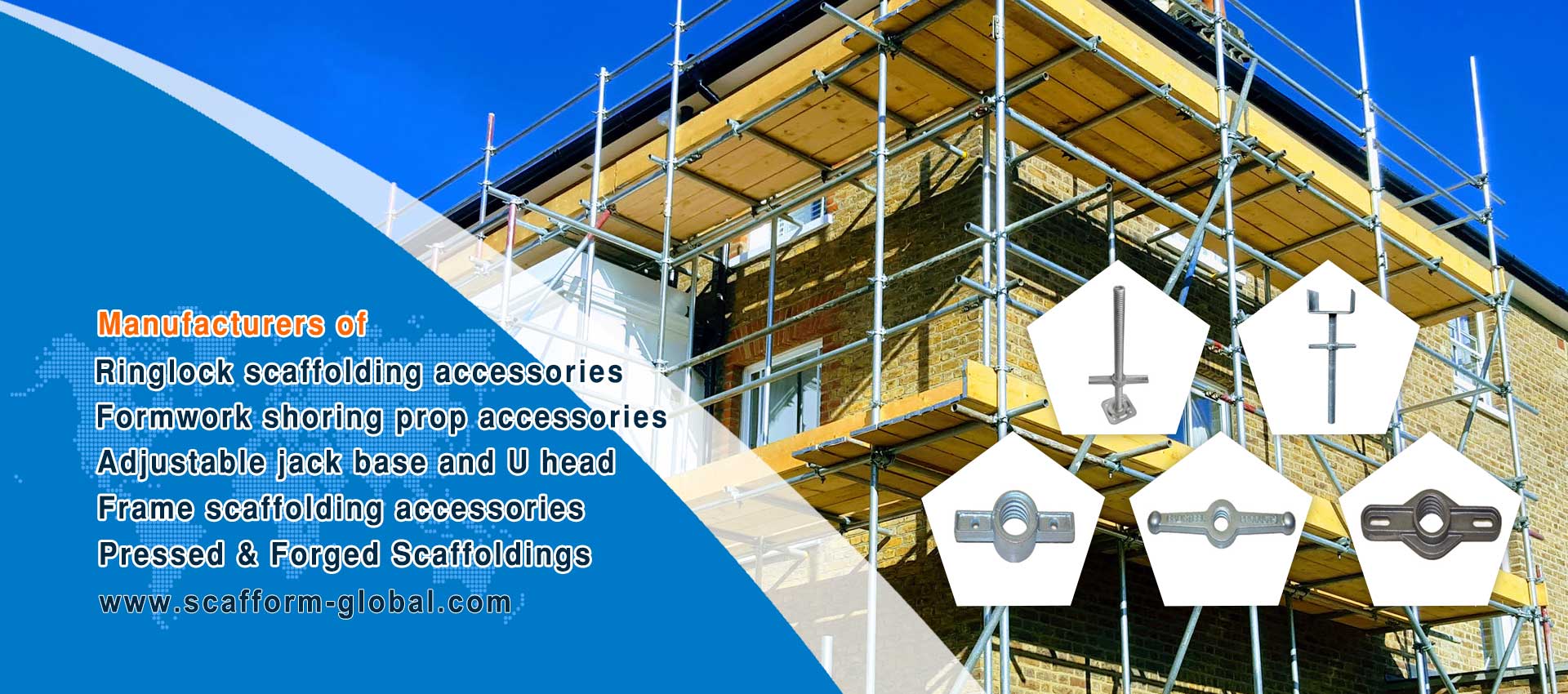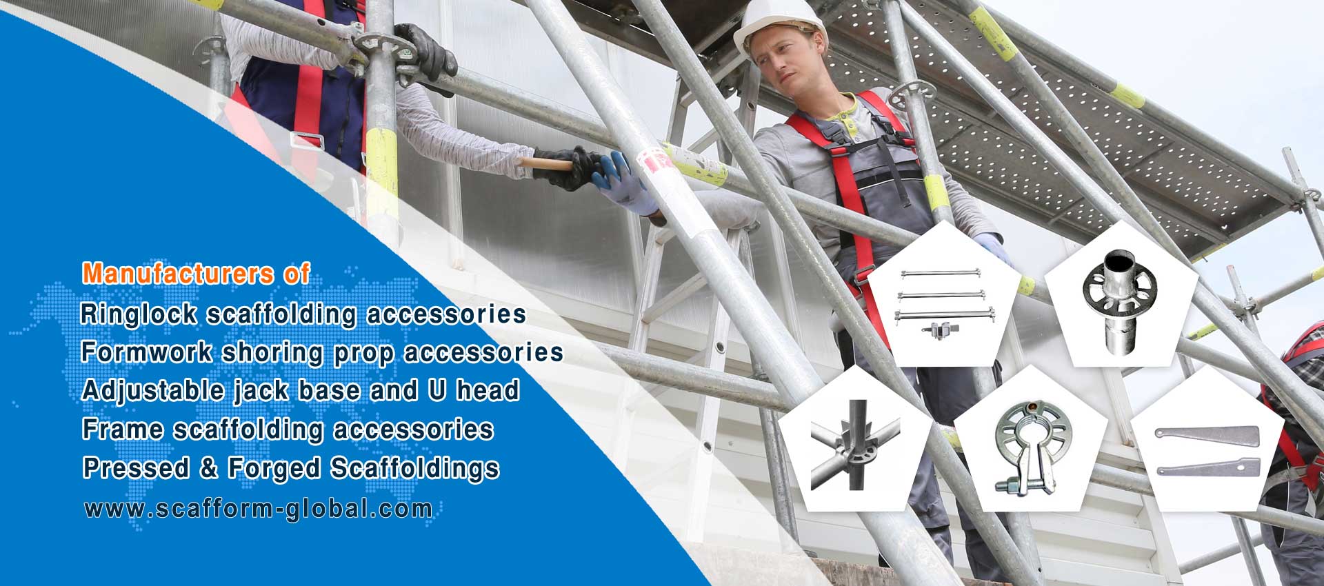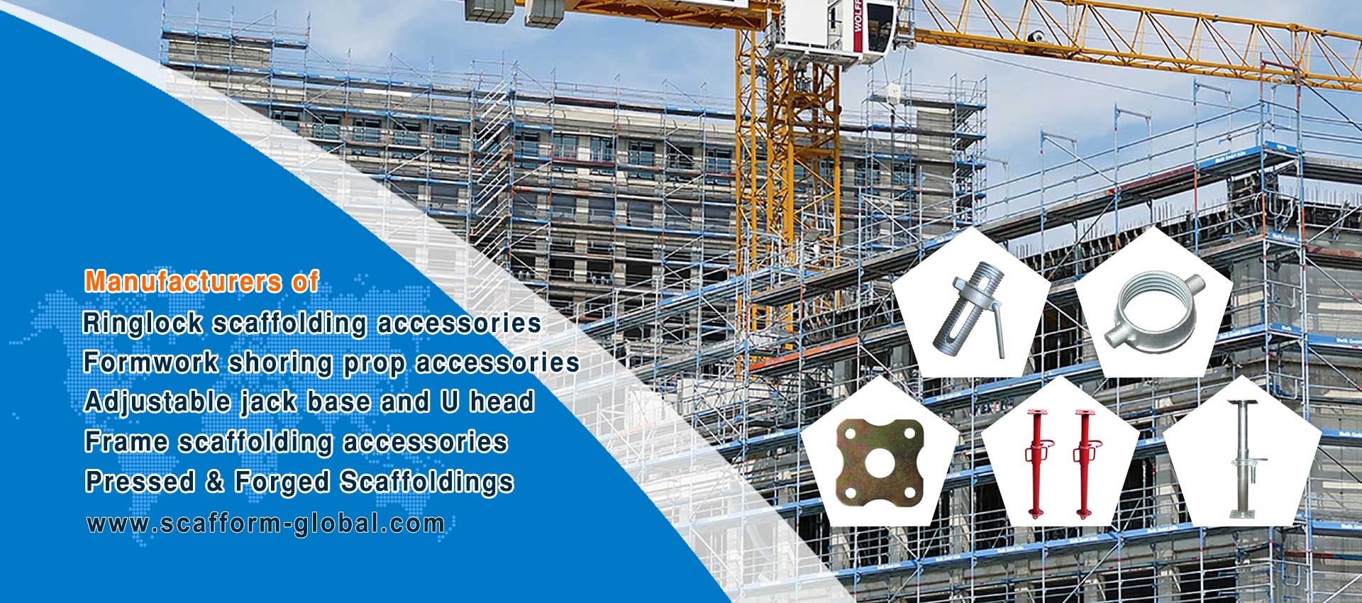 Our main products are scaffolding parts and formwork fittings, including ringlock scaffolding accessories (ledger end, brace end and rossete), cuplock scaffolding accessories (top cup and bottom cup), scaffolding tube and all kinds of couplers, adjustable jack base and u head, frame scaffolding systems, formwork shoring prop systems and parts, tie rod systems and formwork fasteners (anchor nut, wing nut, formwork clamps). All these products are produced by high quality material and exported at competitive prices. We have professional design and product group, we can customize all products for customers and meet their demands at the first time, some customers even prefer us to design for their new products.